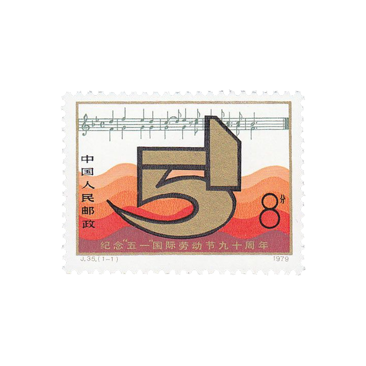 全套1枚,画面是由镰刀和锤子组成的“51”字样,上端是国际歌乐谱,下部为红色,象征着工人阶级在国际歌声中前进。