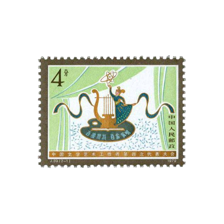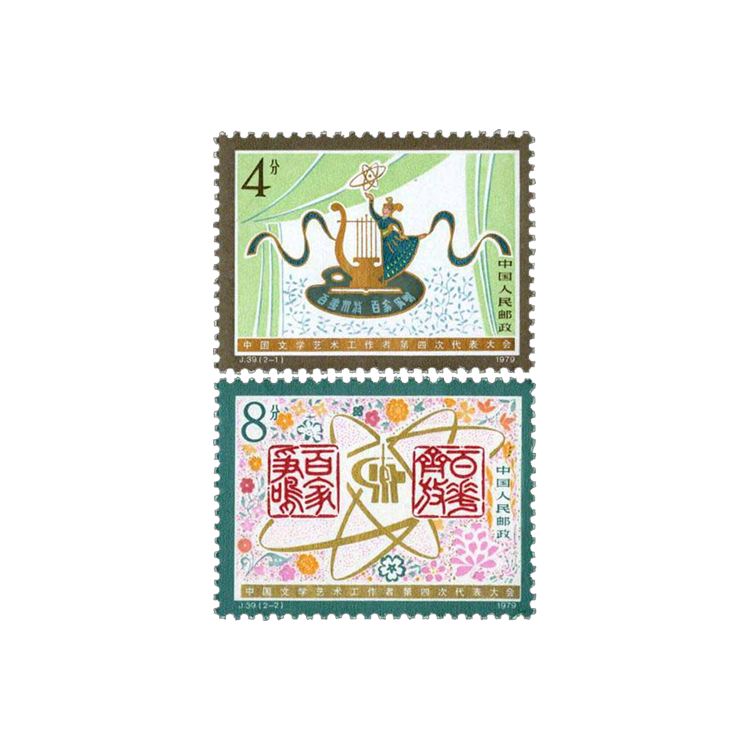 2-2为“百花齐放百家争鸣”。画面主图是篆刻的“百花齐放”、“百家争鸣”八个字,技法娴熟,被海外集邮专家称为是“一套体现了中国篆刻艺术的精美邮票”,背景图案为工农兵所使用的工具和鲜花万朵,象征了文艺为工农兵服务的毛泽东文艺方针,同时也渲染出节日气氛。