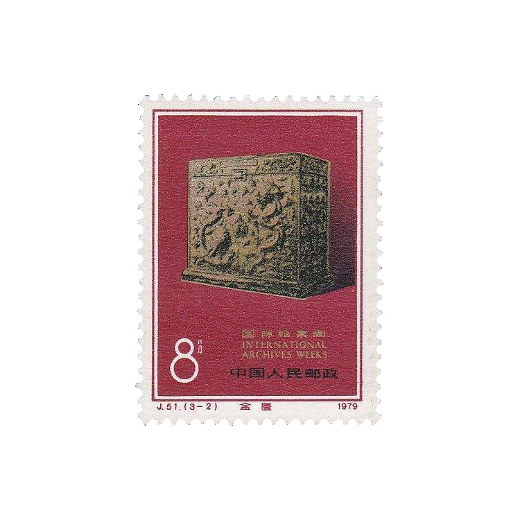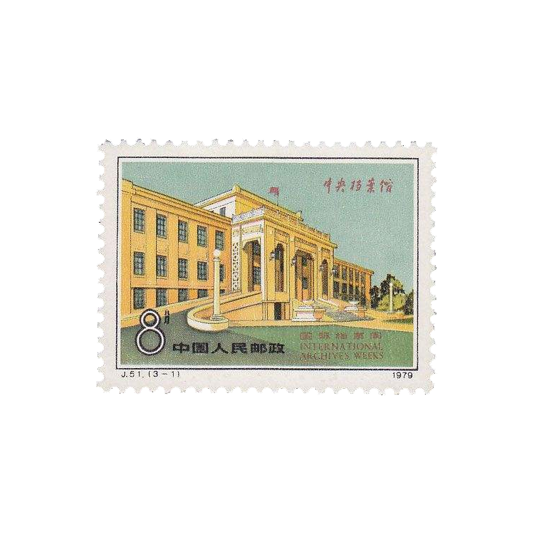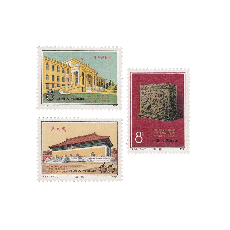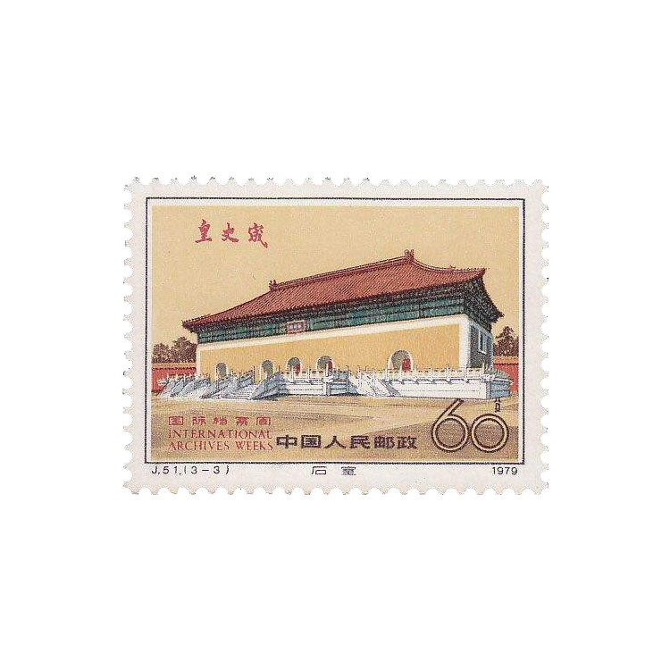 为纪念国际档案周,中国邮电部于1979年11月26日发行了这套纪念邮票。邮票中的“中央档案馆”建于1959年,是保管党和国家重要档案和文件的处所。“中央档案馆”的匾额是周恩来题写的。邮票中的“皇史緀”是专藏帝王的手迹、实录和秘典的地方,也是我国目前保存最完整的古档案馆之一。它始建于明朝嘉靖十三年(1534),1536年落成,位于北京南池子。解放后这里又按原状进行了修缮。