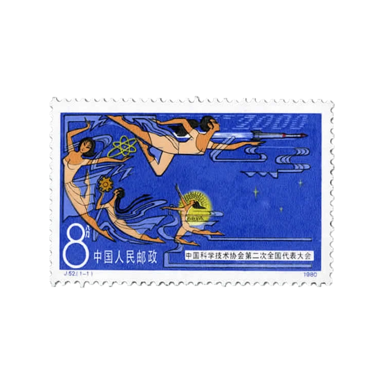 本套邮票共1枚。邮票题为“飞天”。飞天是人类自古已有的幻想,这里从一个方面反映了人类可以借助科技的力量,摆脱自然对我们的种种限制,自由自在地在太空中翱翔。画面背景为蔚蓝的宇宙空间,四位少女身着薄纱衣裙,张开双臂,在天空中遨游。其中最上面的一位少女舒展四肢,似正在追逐远处的一枚火箭。画面左边的两位少女则为手捧象征科技的标志。整个画面形象生动,人物姿态优美,极具浪漫色彩。