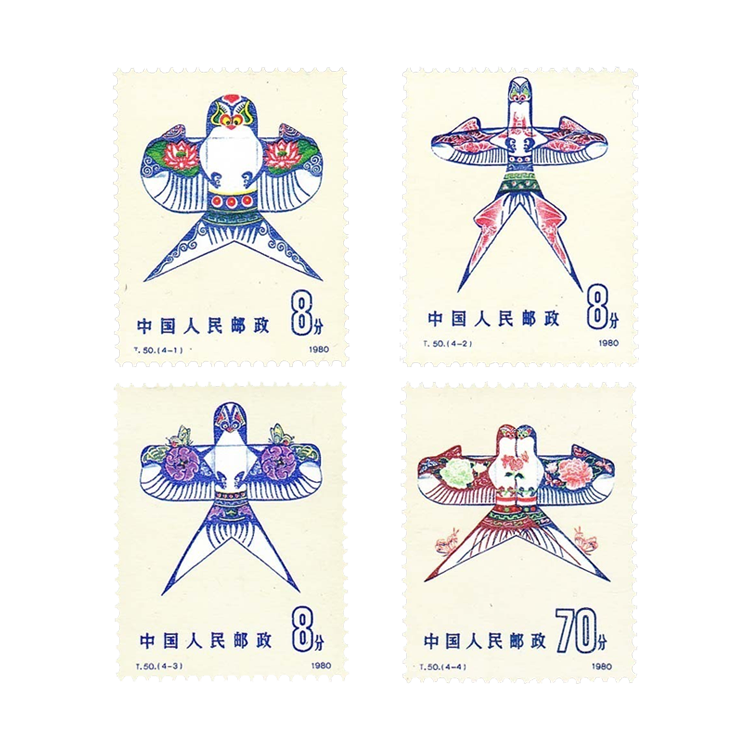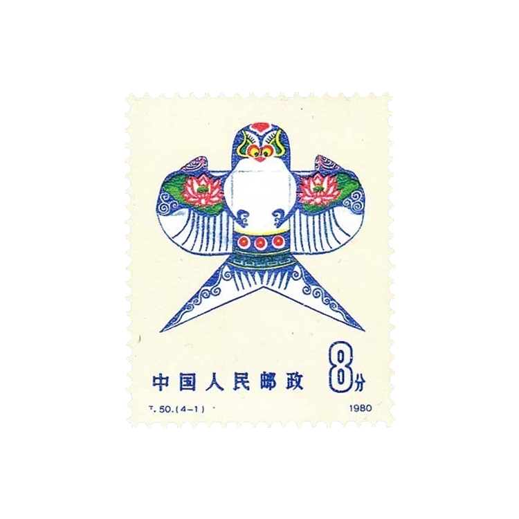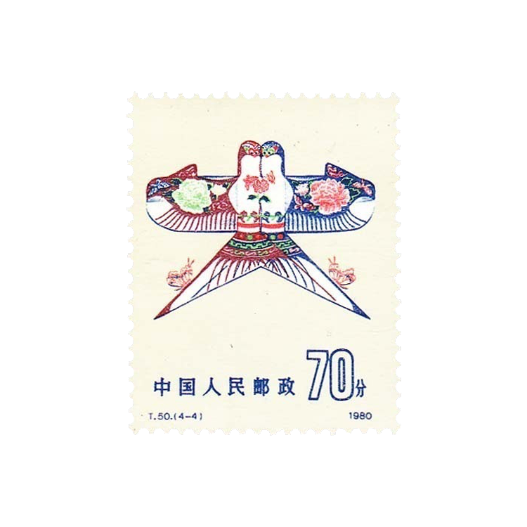 T50风筝又名纸鸢,是中国民间传统游戏之一。据传春秋时期有一位名叫公输般的工匠,用木头做了一个木鸢用以窥探宋国的城市里面的情景,后来用纸代木,称为纸鸢。到了五代时,又在纸鸢上系竹哨,声如筝(筝是中国一种传统民族乐器)鸣,因此又称为风筝。风筝式样很多,大多做成鸟、兽、虫、鱼的形状。这套邮票上的风筝图案选自曹雪芹的《南鹞北鸢考工志》。曹雪芹是中国的一位伟大文学家,他的长篇小说《红楼梦》是中国、也是世界文学史上的不朽杰作。