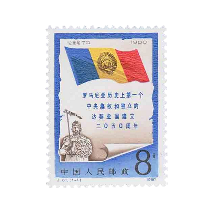 邮电部为纪念罗马尼亚达契亚国建立2050周年,1980年9月20日,发行了《罗马尼亚历史上第一个中央集权和独立的达契亚国建立2050周年》纪念邮票,全套1枚。