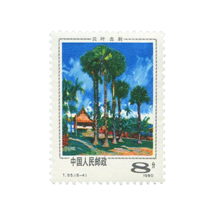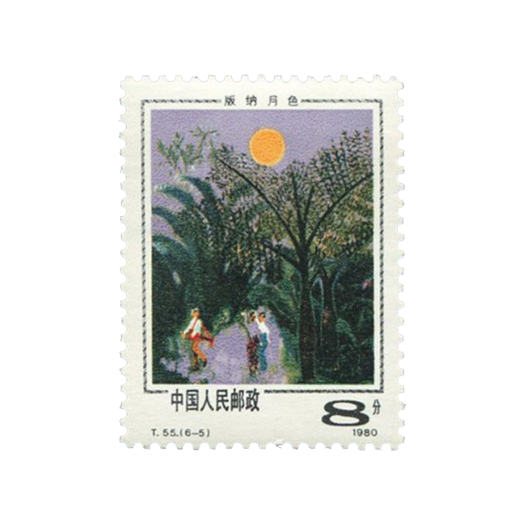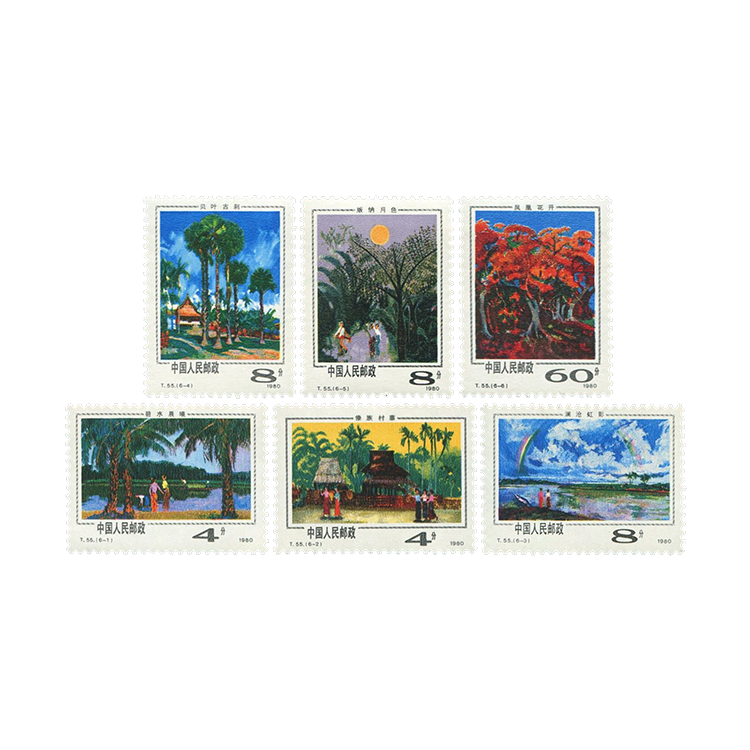 第四图:《贝叶古刹》。画中是西双版纳最负盛名的橄榄坎曼春满寨子,江水清幽,林木茂密,古老的傣族佛寺和幢幢竹楼掩映在绿荫中。傣族普遍信仰小乘佛教,几乎每个村寨都有一座佛寺。画中佛寺前有五棵高大的贝多罗(亦称贝叶树),因贝叶可经处理后代纸,古印度人常以此写佛经,后称佛经为贝叶经。贝叶古刹代表了西双版纳独具特色的景观。