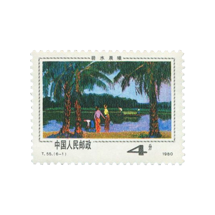 第一图:《碧水晨曦》。画面为西双版纳澜沧江畔,江面如镜,岸边长着几棵巨大的棕榈树,几名傣族姑娘在江边汲水。傣族是生活在西双版纳的主要民族,妇女服装一般上为圆领窄袖短衫,下穿长到脚背的筒裙,头上打发髻,顶于脑后或稍侧,插梳子或顶一块大花头巾。傣族妇女服饰是西双版纳风情的重要内容之一。
