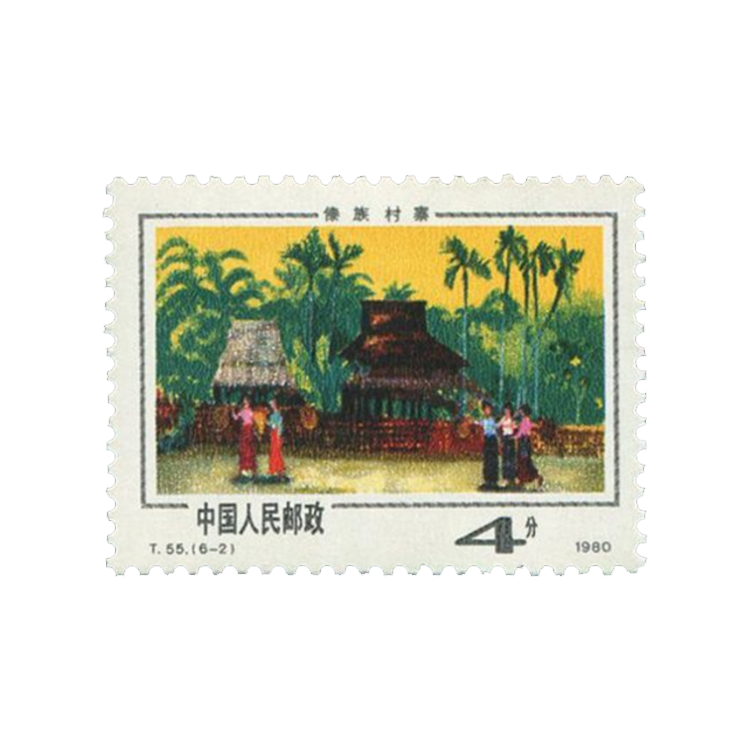 第二图:《傣族村寨》。西双版纳湿热多雨,为通风避暑、防潮防兽,傣族居处多为下部架空的干阑式竹楼。竹楼呈正方形,屋顶为三色锥状,用木片、瓦或草盖项。整个竹楼用20余根粗大的竹子或木料支撑,柱子建在石墩上,以防止腐烂。傣楼的造型既是生活功用的选择,也具有较高的艺术价值。