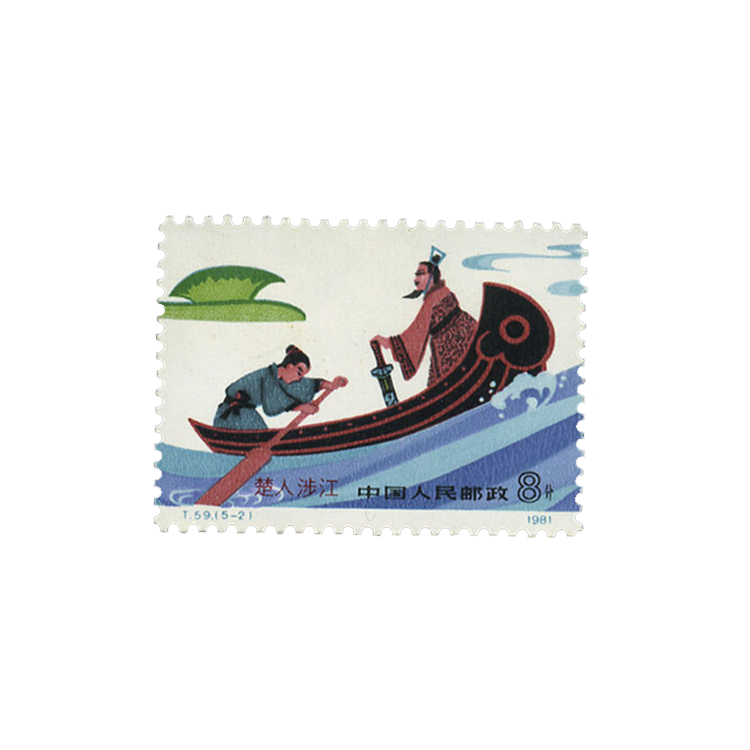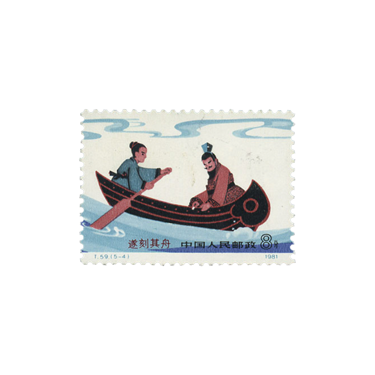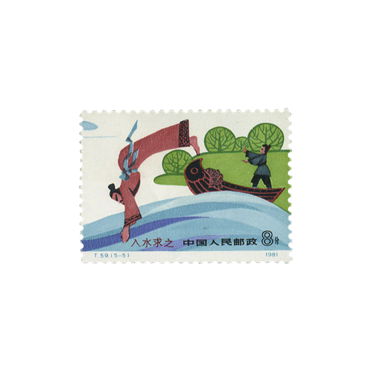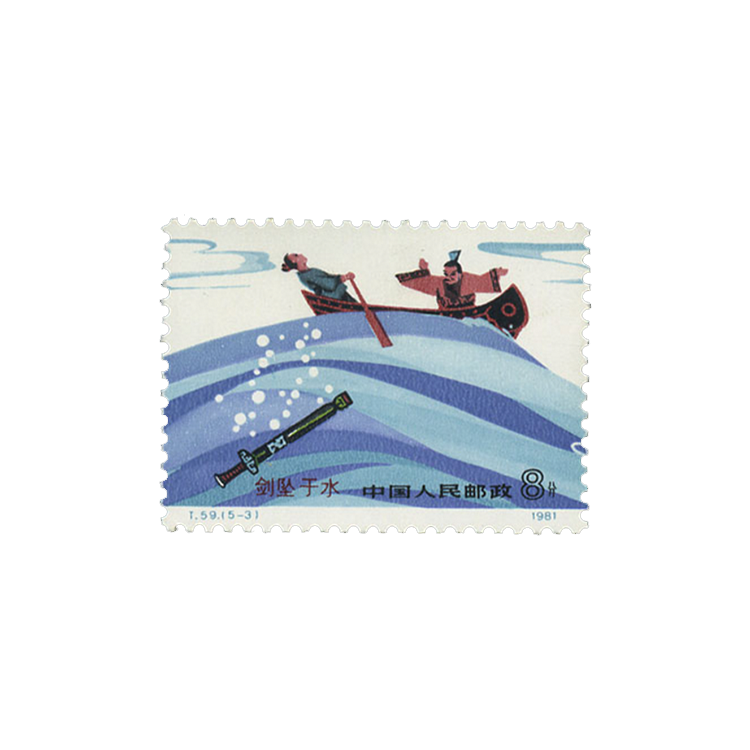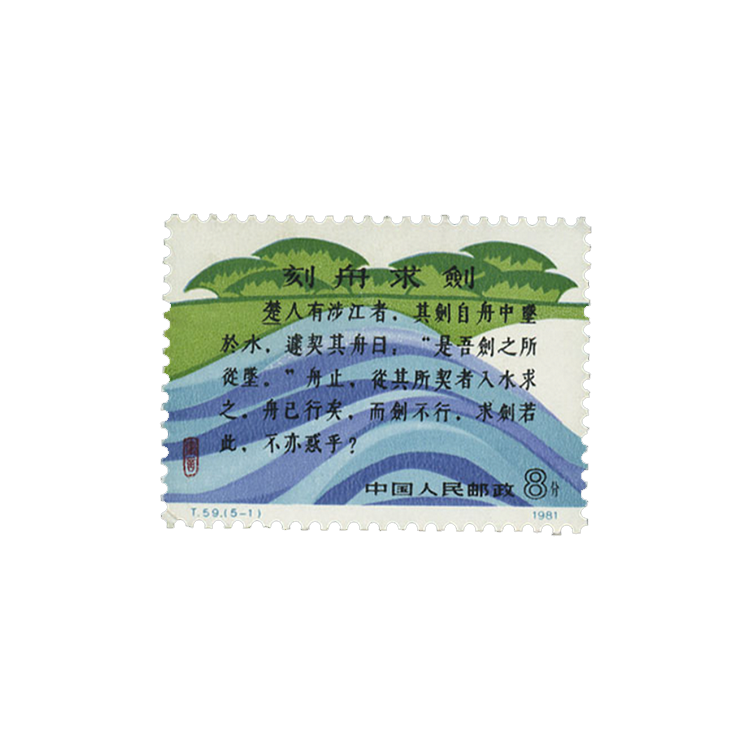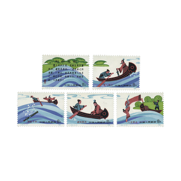 1981年3月10日,为了反映中国丰富的文学遗产,中华人民共和国邮电部发行一套《寓言——刻舟求剑》特种邮票,全套5枚。T•59•(5-1)图案以绿树和水浪为背景,用黑色文字标出了寓言《刻舟求剑》的原文:“楚人有涉江者,其剑自舟中坠于水,遽契其舟曰:‘是吾剑之所从坠。’舟止,从其所契者入水求之。舟已行矣,而剑不行。求剑若此,不亦惑乎”《刻舟求剑》讽刺那些不懂事物发展变化规律、不能因时制宜的愚人。它告诉读者,客观事物是发展变化的,人的主观认识应该随着客观事物的发展有所改变,而不应该静止地孤立地看待问题。
