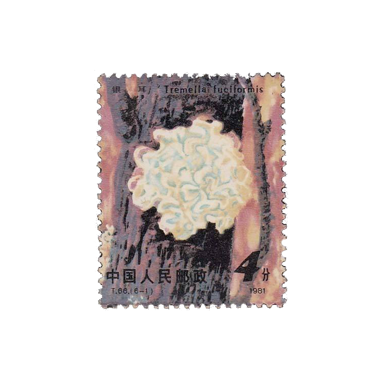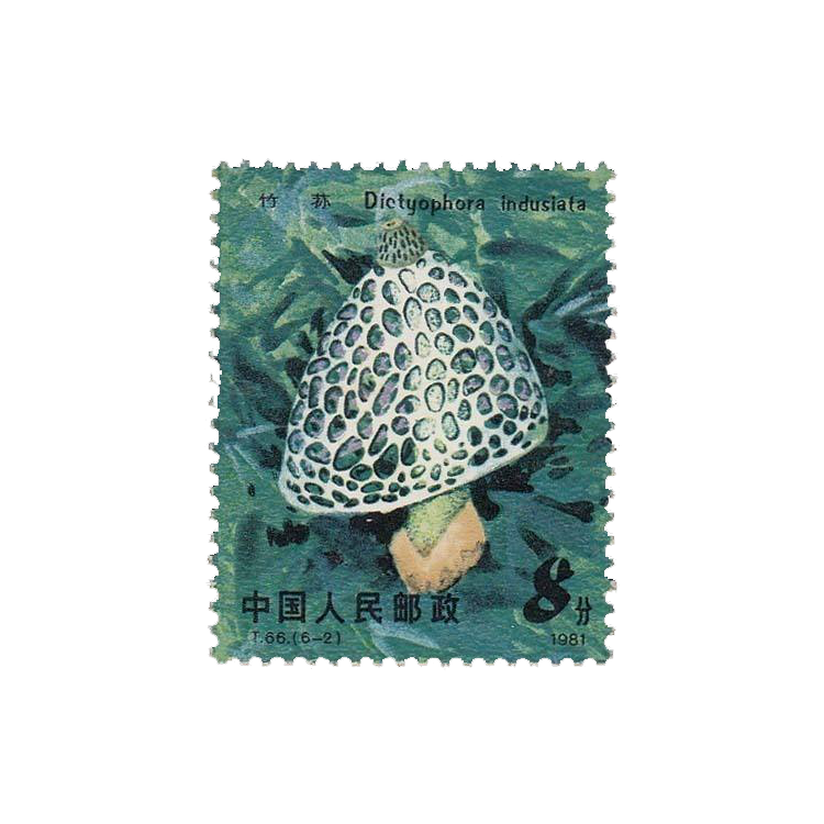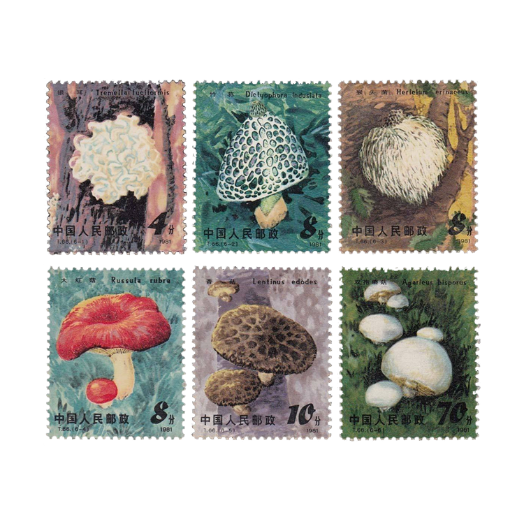 这套邮票上的六种食用菌分别是银耳、竹荪、猴头菌、大红菇、香菇、双孢蘑菇。它们各具姿态,有鸡冠状、猴头形等,颜色各不相同,有白、黑、绿、蓝、黄、红等颜色,鲜艳夺目。银耳为白色,半透明状;竹荪呈蓝色,呈猴头形;猴头菌和双孢蘑菇为白色;大红菇呈淡红色,香菇呈黑色,它们都是蘑菇形状,配上邮票背景不同颜色,使得邮票图案十分醒目。