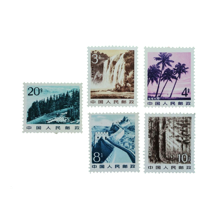 本套邮票共5枚,展现了中国各地的五处风景胜地,其中有历史古迹,如万里长城;但更多的是自然风光,如天山、黄果树瀑布;既有热带风光,如海南风光;又有塞北风光,如东北林海。设计者精选了中国风光之精粹,浓缩于方寸之间。在构图上,设计者善于先取各地风光最具特色者,或浓或淡,或简或繁,或密或疏,使整套邮票的布局错落有致,既各自成趣,又浑然一体。