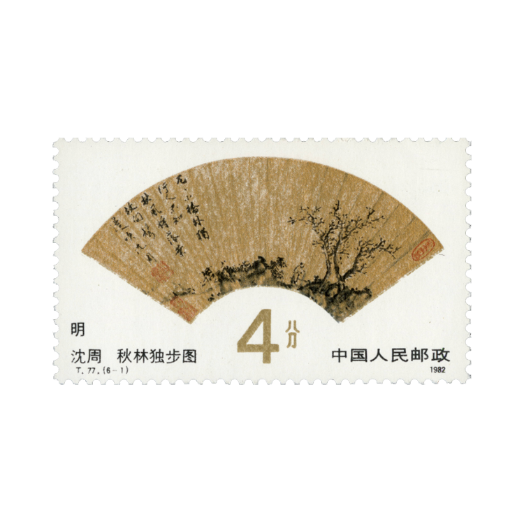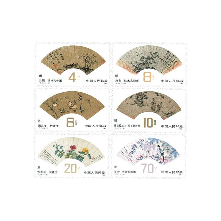 邮票所选的这六幅扇面画都是中国明清两代著名画家的得意之作。从表现题材上看,既有山水、人物,又有花草鸟虫;从表现手法上讲,既有酣畅淋漓的水墨写意,又有精雕细琢的工笔重彩,可谓各领风骚。