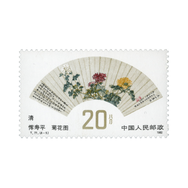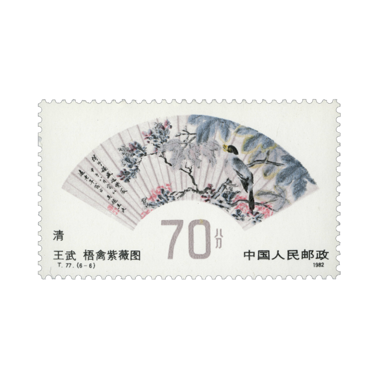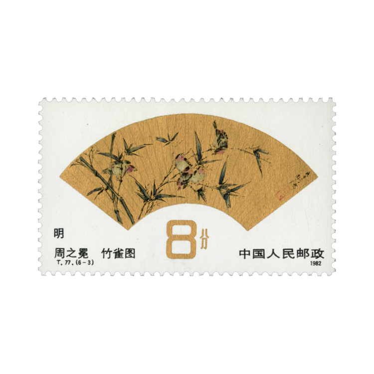 在邮票设计上,显现出的和谐自然,符合扇面画的意境和内在气质。在构图上使人感觉到丰富的变化,从而进一步突出了主题作品。邮票主图鲜明、清新明快,无任何装饰,只采用无华的白底衬托着丰富的扇面,烘托了主体。T77的第3枚“竹雀图”在1982年最佳邮票评选中,获得了最佳印刷邮票。