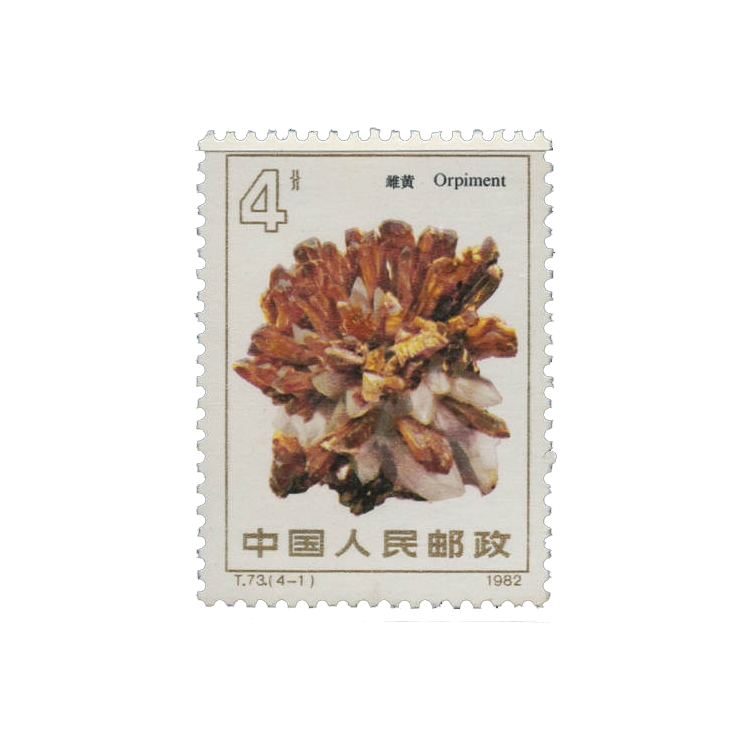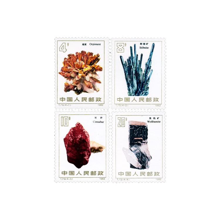 本套邮票于1982年8月25日发行,共有4枚。这4枚邮票分别以雌黄、辉锑矿、辰砂和黑钨矿为主题,这四种矿石是中国举世瞩目的矿产珍品。
