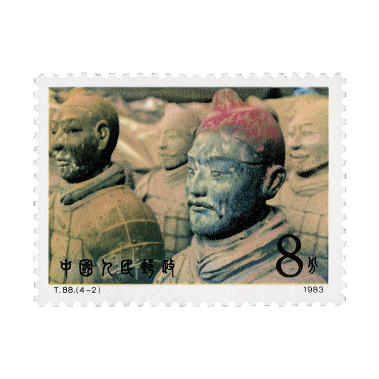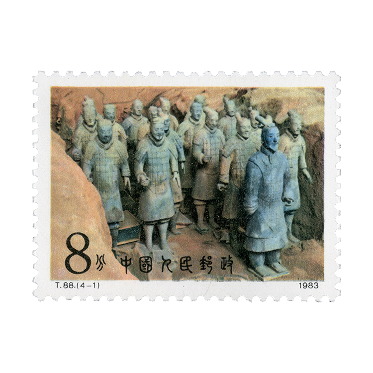 1983年6月30日,为了反映中华民族光辉灿烂的艺术创造,中华人民共和国邮电部发行一套《秦始皇陵兵马俑》特种邮票,全套4枚。吴建坤设计。影写版。齿孔11度×11.5度。背面刷胶。邮局全张枚数50(5×10)。北京邮票厂印制。这套邮票图案采用纪实性摄影形式,巧妙运用以点概面、点面结合的艺术手法,精心剪裁,从不同角度,在不同的光线下,既再现了秦始皇兵马俑坑的基本概貌,规模宏大。气势雄伟,也捕捉住了兵马俑雕塑造型的艺术特征,形象生动,神态逼真,颇富艺术魅力。在色彩上,特别注重土黄色,使画面具有一种黄土地的气息。