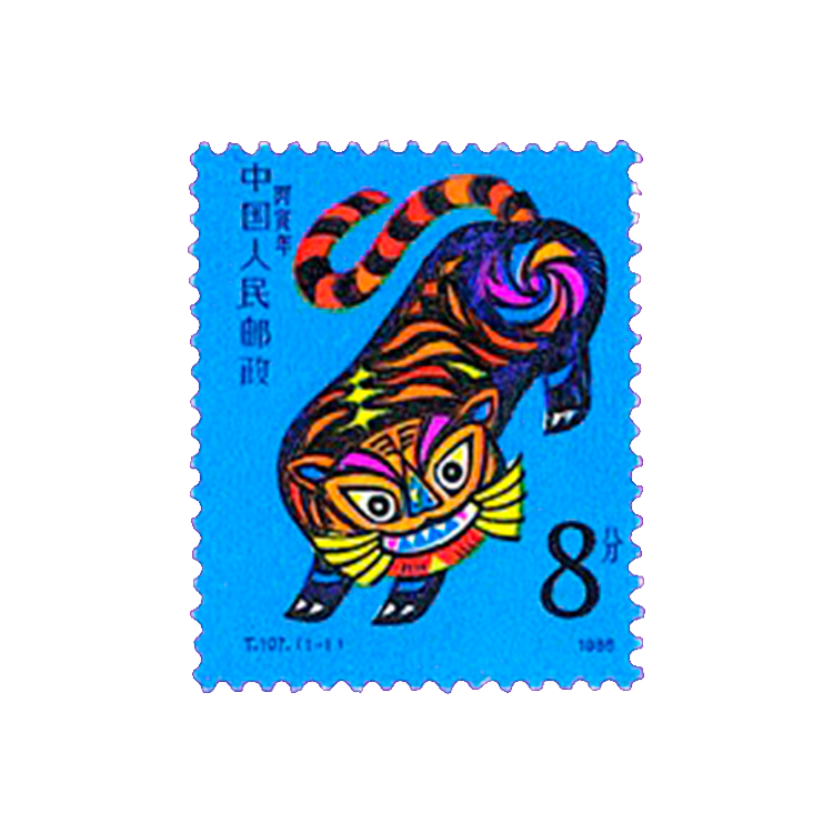 本套邮票在设计者笔下,老虎那虎视眈眈的眼睛、强有力的身躯、优美的虎纹都给人以强烈的艺术感受。这只虎威风凛凛、咄咄逼人,同时又显出一丝稚气和憨态。作者采用了民间传统装饰的手法,其图案简洁单纯,概括性强,但又神形兼备。