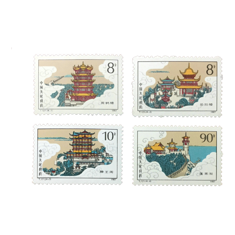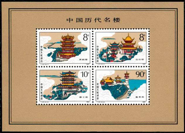 1987年10月30日,为展现中国历代名楼的建筑风采,中华人民共和国邮电部发行一套“中国历代名楼”特种邮票,编号T121,全套4枚。