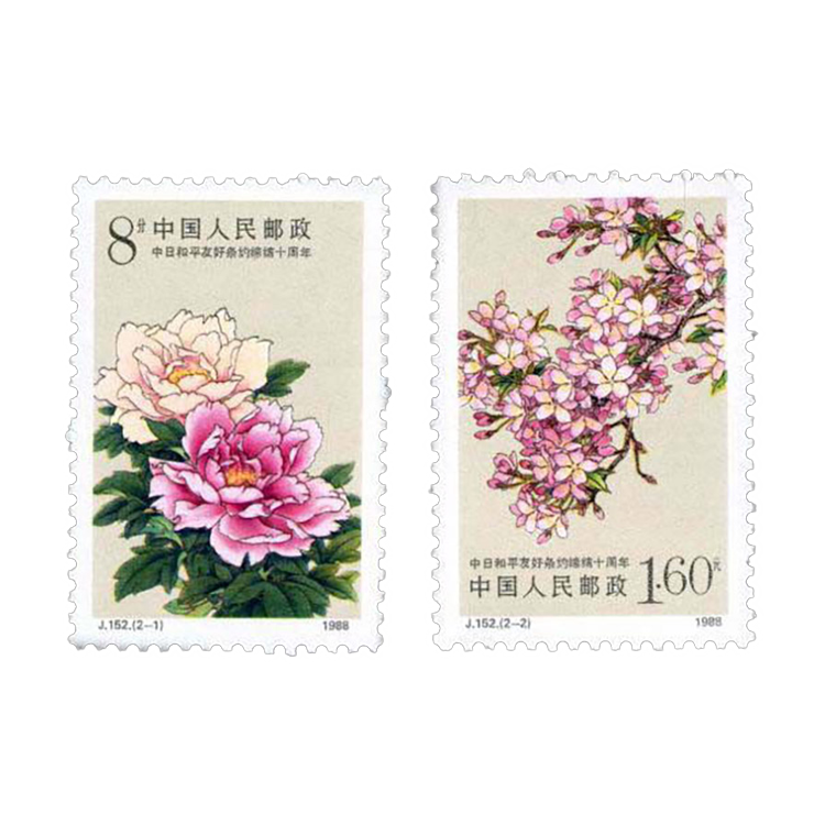 1988年8月12日,为纪念中日和平友好条约缔结十周年发行该套邮票,全套共2枚。
