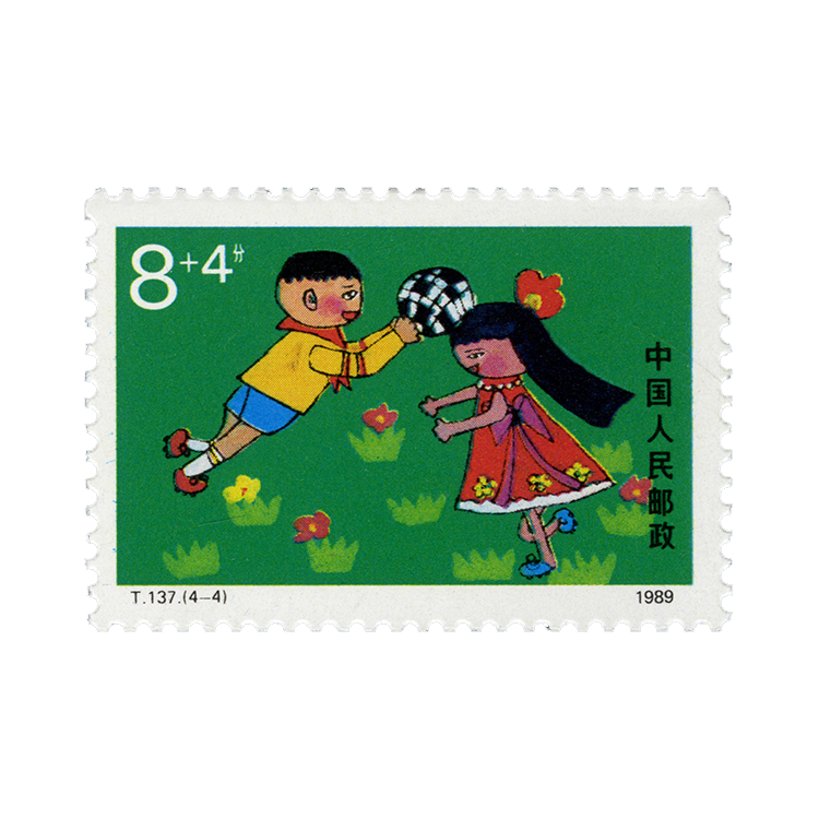 4-4为“拍球”。两个小朋友在玩球,表现了少年儿童天真烂漫的性格,以及对生活的热爱、对美好明天的憧憬。邮票图案采用抽象的表现手法,色彩强烈,具有时代气息和稚拙韵味,充分表现了儿童的心态、渴求和梦想。