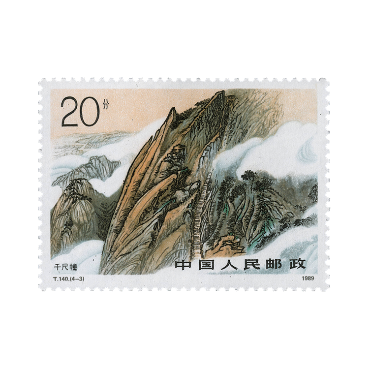 4-3为“千尺幢”。它位于通往北峰的山道上,是一条陡而长的石罅,左右挂有铁索,游人全靠拉着两边的铁链上山,在几乎笔直的石壁上凿有260多级石阶,仅容足尖。