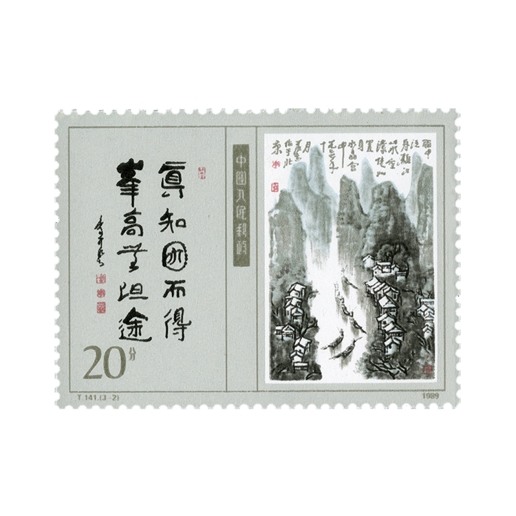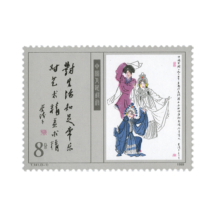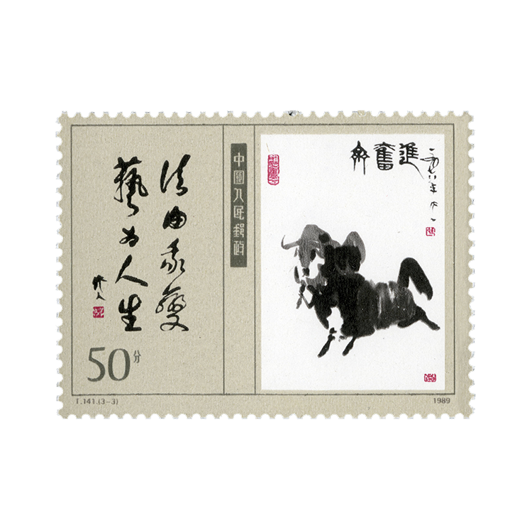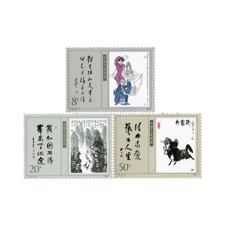 “当代美术作品选”特种邮票,编号T141,全套3枚,1989年9月1日发行。分别选取当代美术大师叶浅予的人物画《白蛇传》、李可染的山水画《细雨漓江》、吴作人的动物画《齐奋进》。