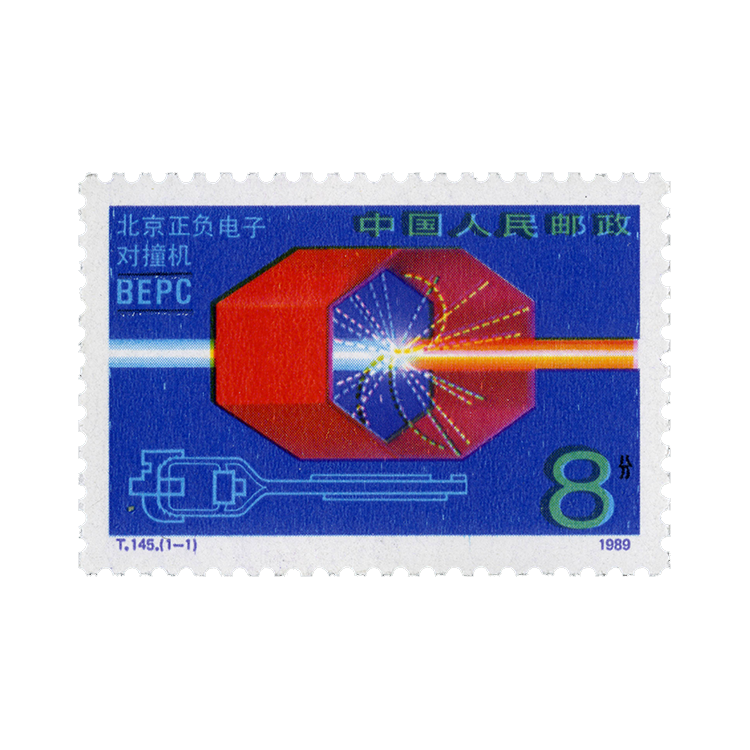 1989年11月1日邮电部发行的T145"北京正负电子对撞机"采用蓝色背景,全套1枚。这套特种邮票,主图为北京谱仪的外形、正负电子对撞的象征图案,和英文BEFC。