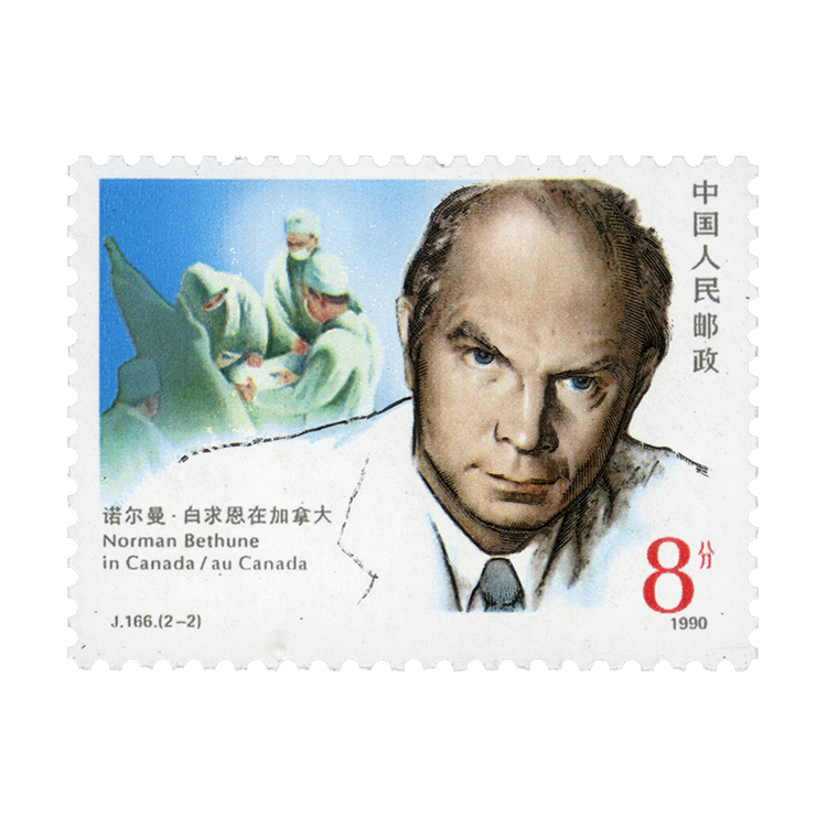 诺尔曼·白求恩(1890——1939),出生于加拿大安大略省格雷文赫斯特镇。1936年西班牙内战期间他作为志愿人员参加战地医疗工作。中国抗日战争爆发后,他率加拿大医疗队来到延安,奔赴抗战前线,以精湛的医疗技术为中国人民的解放事业做出了卓越贡献。后因抢救伤员感染中毒,于1939年11月12日逝世。他不仅是著名的外科医生,还是位伟大的国际主义战士。1990年3月3日,中国和加拿大在这一天同时举行隆重的“诺尔曼·白求恩诞生一百周年”纪念邮票首发仪式。