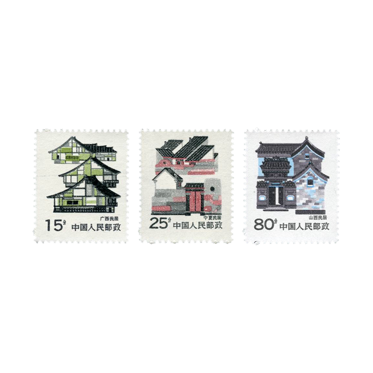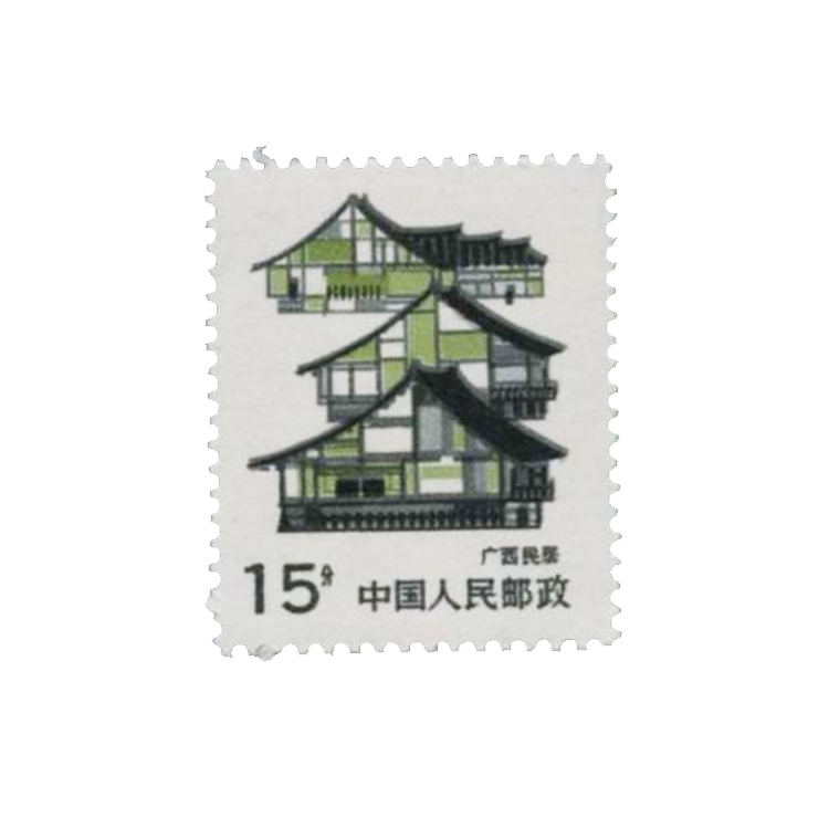 本套邮票共3枚,3-1为“广西民居”。广西位于中国南部,居民多数为壮族,壮族是中国少数民族中人数较多的民族。