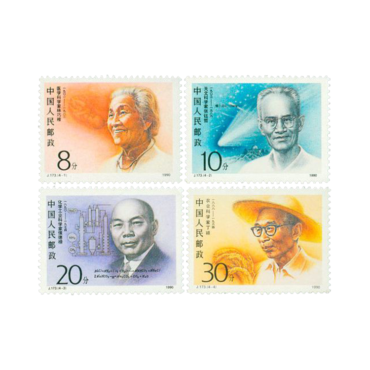 这套邮票以四位科学家为主图,背景辅以所精通专业的简洁内容,人物风度优雅,栩栩如生。
