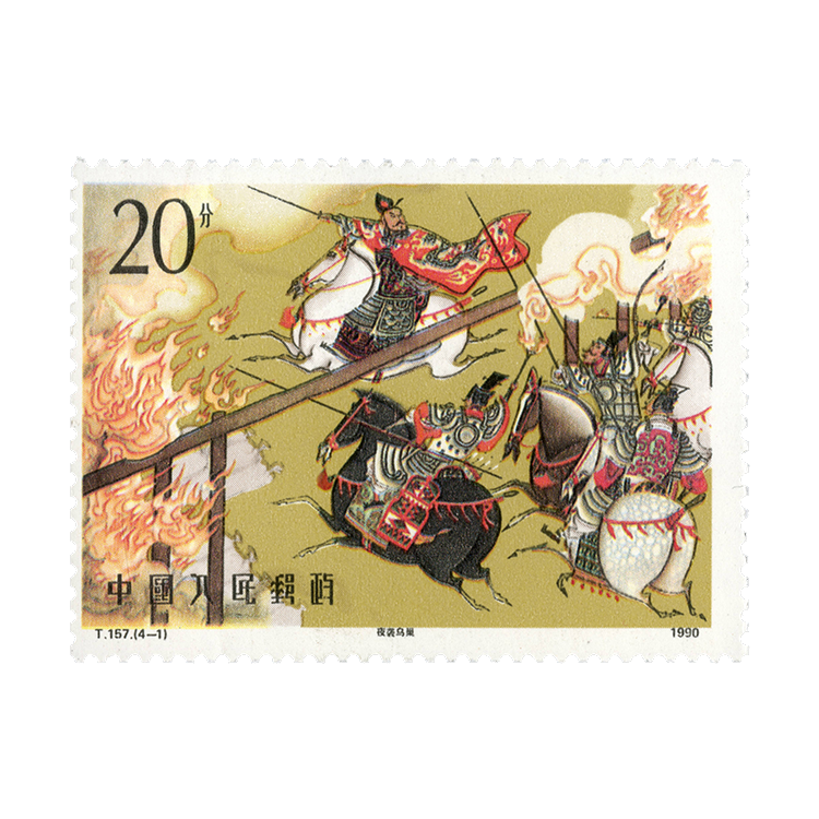 第一枚“夜袭乌巢”选自第三十回“战官渡本初败绩 劫乌巢孟德烧粮”。