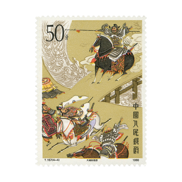 第四枚“大闹长坂桥”选自第四十二回“张翼德大闹长坂桥 刘豫州败走汉津口”。