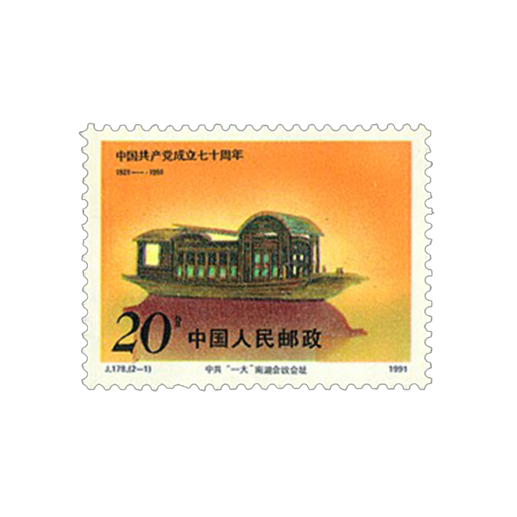 第一枚“中共一大南湖会议会址”,画面暖色调,构图庄重。静静的水面映着南湖船的倒影,船身焕发着金色的、柔和的光辉,把天与水映成一色,带给人们对这一伟大历史事件的深切追溯和无限遐想。