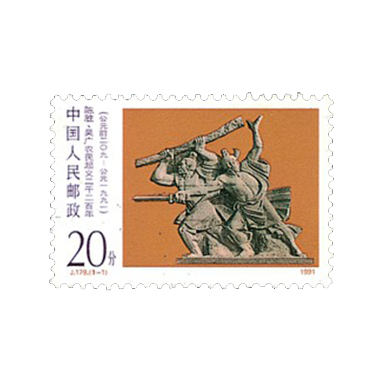 国家邮政局于1991年7月7日发行的“陈胜、吴广农民起义二千二百年”纪念邮票,编号J179,全套1枚。邮票主图为安徽省宿州市起义旧址处的一座花岗岩雕像。画面造型古朴,气势雄浑,展现了农民英雄陈胜、吴广揭竿而起,冲决罗网,—往无前的豪迈气慨。