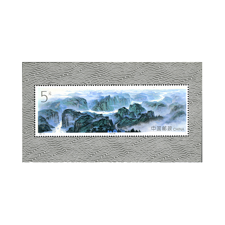 小型张“长江三峡”。为居西的瞿塘峡、居中的巫峡、居东的西陵峡的总称,是长江中最为险要壮观的地段。它西起四川奉节白帝城,东迄湖北宜昌南津关,跨奉节、巫山、巴东、秭归、宜昌五县市,全长204公里。这三个气势磅礴、雄壮峥嵘的大峡谷,音容不同,变化各异,排空出世,魅力天成。其中,瞿塘峡,陡壁悬崖;巫峡,秀丽幽深;西陵峡,滩多水急。狭谷地段,群山笔立,崔嵬摩天;宽谷地段,江面开阔,逶迤蜿蜒;如一条巨龙,滚滚东去。小型张以细密的构图,精微的刻画,全景式地展现了长江三峡的百里长卷,笔法酣畅,色彩浓重,构图恢宏,意境深广。
