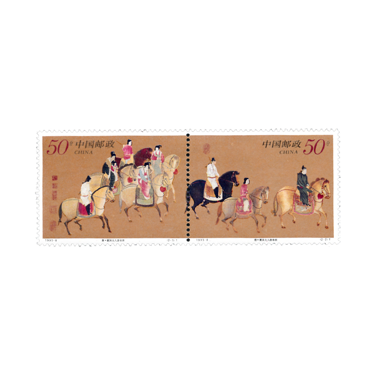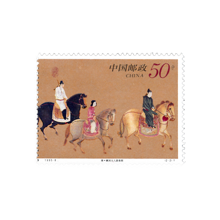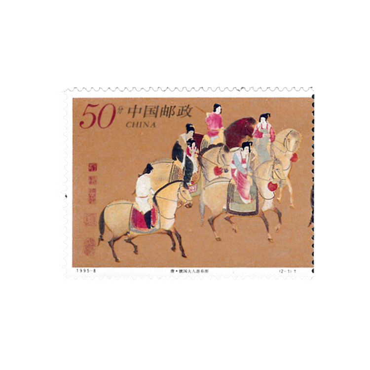 邮票取材于唐代著名画家张萱的一幅传世珍品。描绘的是天宝十一年,再现唐玄宗的宠妃杨玉环的三姊虢国夫人及其眷从盛装出游的景象。画面描写了一个在行进中的行列,人马疏密有度,以少胜多。全画共九人骑马,前面三个单骑开道,依次为男装仕女乘黑色马;中间并列两骑,即虢国夫人和秦国夫人并辔而行,均骑浅黄色骏马。秦国夫人杨玉钗侧脸对着虢国夫人杨玉筝,二人脸庞丰润,雍容华贵,神情悠自若。最后并列三骑,中间为保姆,一手执缰绳一手搂着怀中小孩。保姆右侧为男装仕女,左侧为红衣少女。其中虢国夫人在画面中部的左侧,她身穿淡青色窄袖上襦,肩搭白色披帛,下着描有金花的红裙,裙下露出绣鞋上面的红色绚履。作品表现了贵妇们游春时悠闲从容的欢悦情绪,从一个侧面反映了当时上层社会奢侈淫逸的享乐生活。