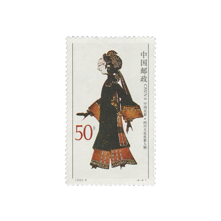 (4-4)为“四川大邑皮影人物”。画面系四川大邑皮影中的旦角,是当地民间艺术家专门为这套邮票提供的人物造型。从额到腮呈圆形,眉目细长,给人以善良、敦厚的美感;雕簇不重精巧而重人物性格刻画,受唐代壁画和川剧影响较多,艺术格调浑厚而大气。