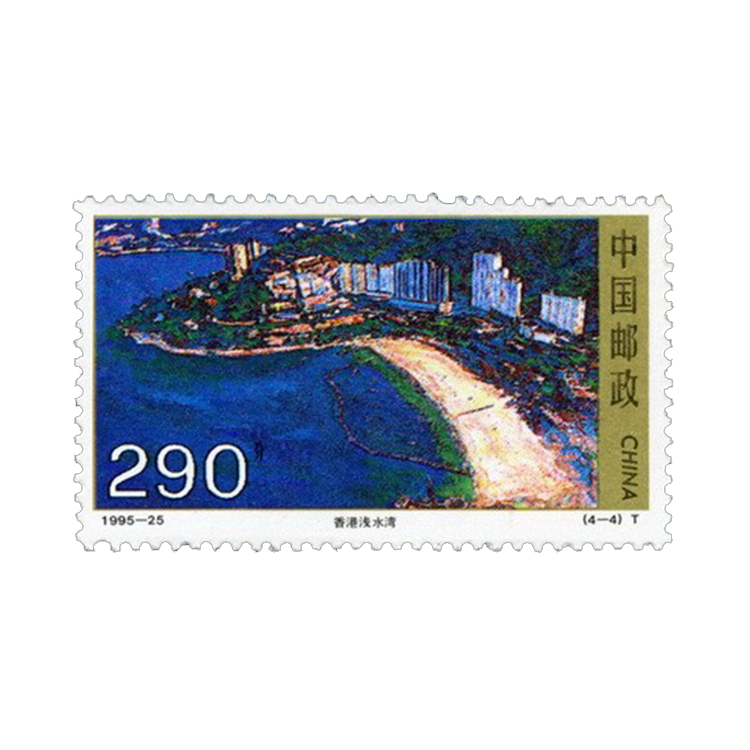 (4-4)为“浅水湾”。描绘了浅水湾海蓝沙白的旖旎风光。浅水湾位于香港岛南部,东有孑孓岗山,北有紫罗兰山,西有丽海堤岸路,南有中湾、南湾。香港有42个海滩,浅水湾是最有名的海浴场所。海岸线绵长,滩床宽阔,砂细水滑,海水清澈见底。湾内各类设备先进,并有香港最大的烧烤区及远近闻名的跳蚤市场、餐厅、酒店、超级市场等。不远处的海滨公园内塑有高达数米的巨型天后圣母及观音菩萨像。浅水湾游客常年不断,可与地中海媲美,有“天下第一湾”和“东方夏威夷”之称。为迎接香港回归祖国,邮电部决定从1995年起,到1997年,每年发行一套有关香港题材的邮票。这套《香港风光名胜》4枚邮票,即为这一系列的首套。四处景点,融文化古迹与现代娱乐为一体,是休闲渡假观光游览的好去处。