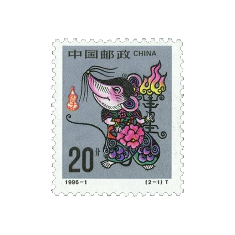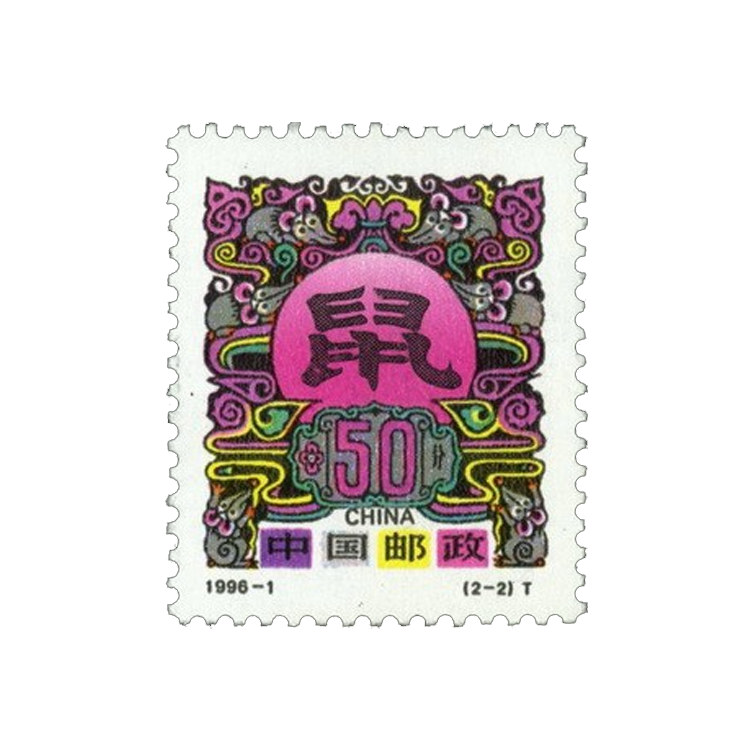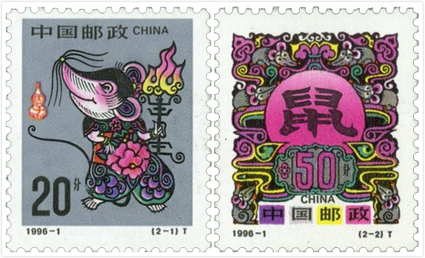 这套邮票是第二轮生肖邮票中的第五套,采用民间年画手法设计和隶书“鼠”字。