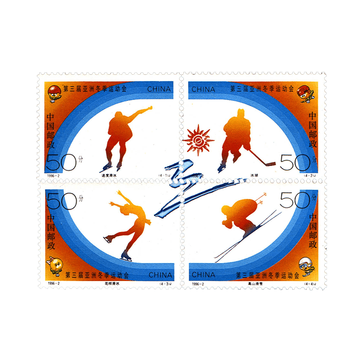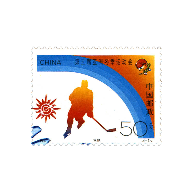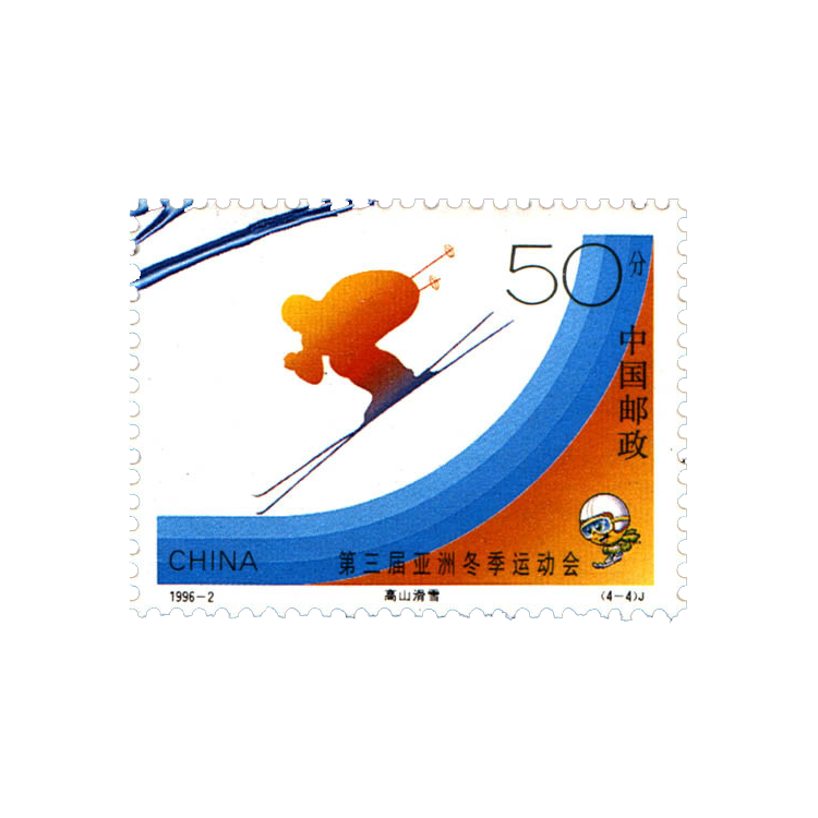 第三届亚洲冬运会于1996年2月4日在我国黑龙江省哈尔滨市冰球馆隆重开幕,由于中亚5国参加,使这届亚冬会的规模和水平都超过了前两届。共设置速度滑冰、短道速滑、花样滑冰、冰球、高山滑雪、越野滑雪、自由式滑雪、跳台滑雪、冬季两项等9个大项、46个小项的比赛,其中冰上项目在哈尔滨市举行,滑雪项目在哈尔滨东南195公里的亚布力滑雪场举行。这届亚冬会的会徽,是由汉字“三”和亚奥理事会会徽中的太阳,构成奋力向前的滑雪运动员的造型,意为“第三届亚洲冬季运动会”。吉祥物则为拟人化的大豆,取名“豆豆”,它活泼俏皮,伸出右手做出“V”的样子,表示热烈欢迎亚洲冰雪健儿的到来,衷心祝愿本届亚冬会热烈精彩,圆满成功。早在1990年7月朝鲜就曾发行过为祝贺第三届亚冬会的召开的纪念邮票,在那枚邮票上展示了亚奥理事会的会徽、冰雪运动员和朝鲜艺术家李永锡先生设计的运动会会徽,会徽图案为三个圆圈和一株覆盖着白雪的枞树,内有1995字样,代表冬天的朝鲜三渊池,表明了亚运会友谊、团结、和平的宗旨。在朝鲜宣布放弃主办权后这枚邮票即被停售。此际,在第三届亚冬会在我国开幕之日,邮电部发行了这套纪念邮票。邮票采用了四方连形式,以纯白色为整套邮票的衬底基调,代表着北方那无垠的、白茫茫的冰雪;整个四方连上有一个似地球状的椭圆形,既限制了白色的面积,又表示了世界性赛会的含义;椭圆外围有3条渐变的蓝色色环围绕,代表冰雪赛场的跑道,突出了冰雪运动所需要的条件;四方连正中为一枚本届亚冬会的会徽,强化了冰雪运动的概念,突出了赛会的主题;4个冰雪运动人物围绕着徽,并被齿孔分割在4枚邮票上,项目的内容分别为速滑、冰球、花样滑冰、高山滑雪,人物按四周跑道的走向确定相应位置,使之与项目本身的特点更为贴切;人物的色彩是从蓝色到红色,从红色到黄色的渲染效果,把参赛运动员不畏严寒、奋力拼搏、发挥体能、挑战极限的体育精神充分表现出来;在跑道的外围,配以与4个项目相对应的吉祥物“豆豆”的形象,底色运用了桔黄色到黄色的渐变,烘托出本届亚冬会的热烈气氛,整个画面表达了本届亚冬会“团结、友谊、发展、进步”的主题。