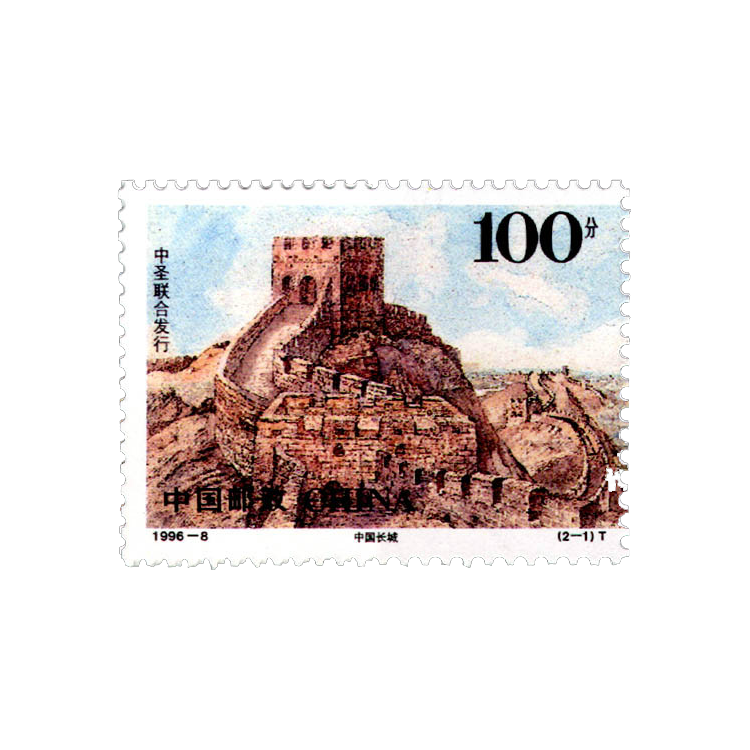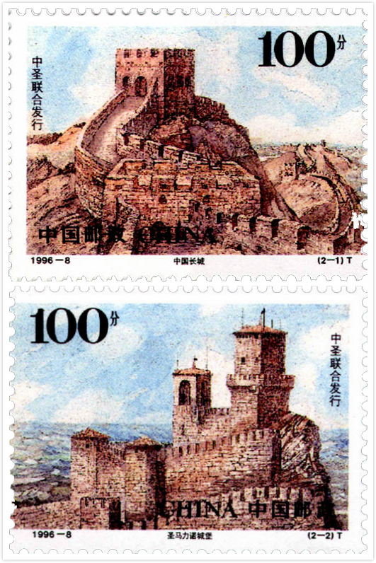 中圣联合发行的《古代建筑》邮票,分别选取中国的万里长城和圣马力诺的古城堡为画面。这两个建筑物同样是两国古代为抵抗外敌入侵而修筑的防御工事,同样体现了两国人民的聪明智慧和坚强不屈,同样是两国各自的代表性建筑,是两国民族精神和意志的象征。邮票画面在雄伟傲岸之中显得斑斑驳驳,以体现出饱经沧桑的历史韵味;而采取连票形式,融合了远隔千山万水的异国景物,表现出两国的坚实友谊。两座古代建筑在同一片蓝天下,如同高高耸立的纪念碑,弘扬着各自民族的不屈不挠斗争精神。