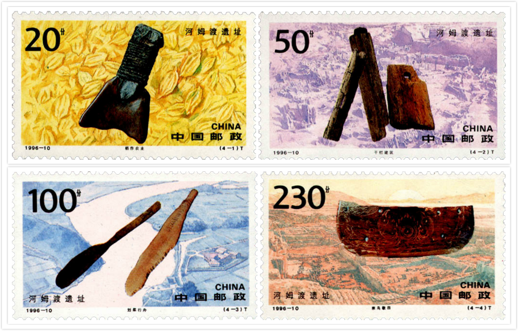 1996年5月12日,为了展示中华民族悠久的文化遗产,邮电部发行了《河姆渡遗址》特种邮票,全套4枚。