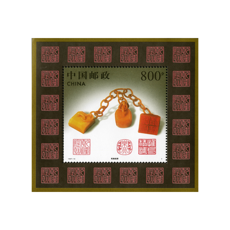 小型张为“乾隆链章”。图案是北京故宫博物院内所藏溥仪捐献的(乾隆遗物)带链田黄石印章,被视为“宫中瑰宝”。链章是利用一整块黄玉,雕刻成两枚方形章和一枚椭圆形章,并由三条活动的链环连在一起,三枚章分别篆刻有“乾隆宸翰”、“惟精惟一”、“乐天”的印文,为稀世奇珍。小型张边框四周还用20枚“乾隆宸翰”印章作为装饰,使之与邮票主图上的三枚红色大印相得益彰。
