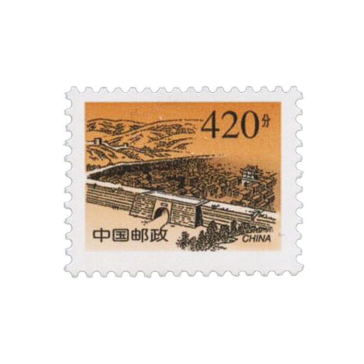 古代中国长城始建于春秋时的楚国。秦始皇统一中国后将几段长城连成一脉,起临洮,迄辽东。此后历代屡有修筑,明代曾加固、扩建达18次,西起嘉峪关,东至山海关,全长5440公里,号称万里长城。这次发行的《长城》普票东端选择了辽宁宽甸境内的虎山长城,反映了秦始皇统一六国后的长城规模。22座雄关各展英姿:有边关重镇多层建筑的城楼(如山海关、边靖楼、嘉峪关),也有一夫当关、万夫莫开的险要关卡(如九门口、得胜口、三关口),更有雄踞山巅、俯视八方的碉楼(如古北口、金山岭、黄花城),还有绵延群山中的要塞(如紫荆关、慕田峪、娘子关)。这些形式各异、因地制宜、各有其用、易防难攻的大小城堡都是古代军事家和劳动人民的创造。