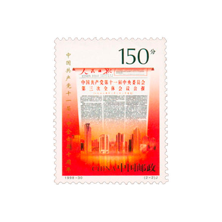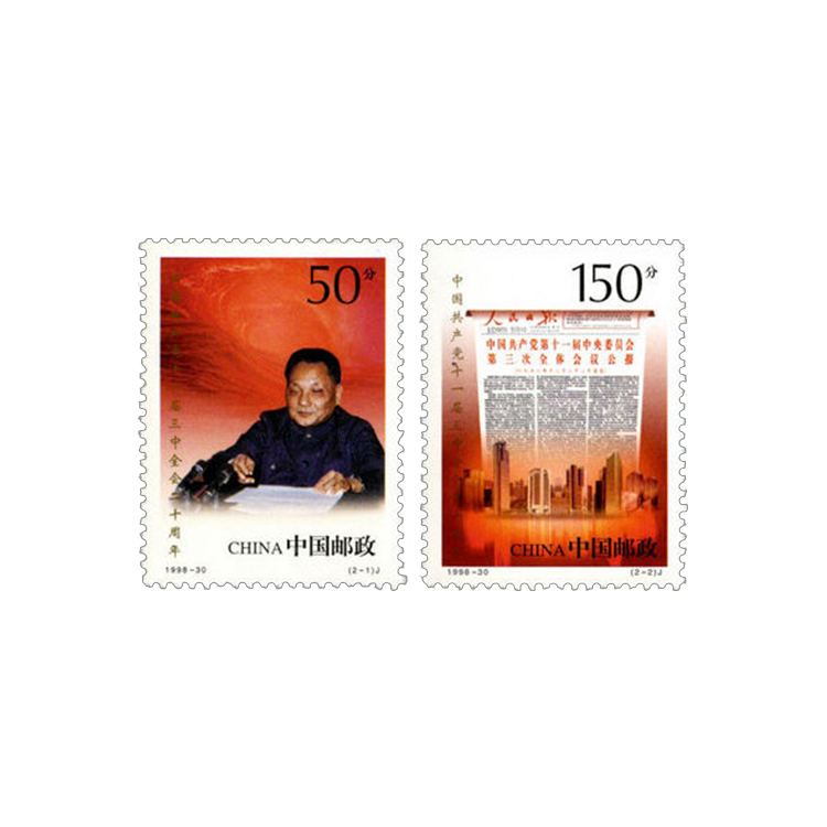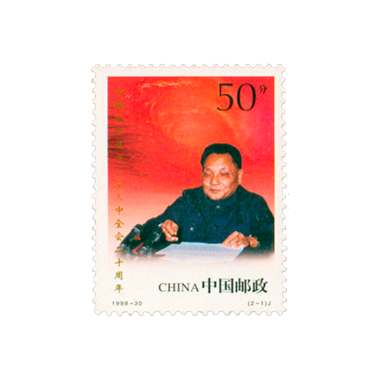 1998年12月18日,为纪念中国共产党十一届三中全会20周年,也是中国改革开放二十年,国家邮政局发行“中国共产党十一届三中全会二十周年”纪念邮票,编号1998-30,全套2枚。名称分别是邓小平同志在十一届三中全会上、历史的伟大转折。
