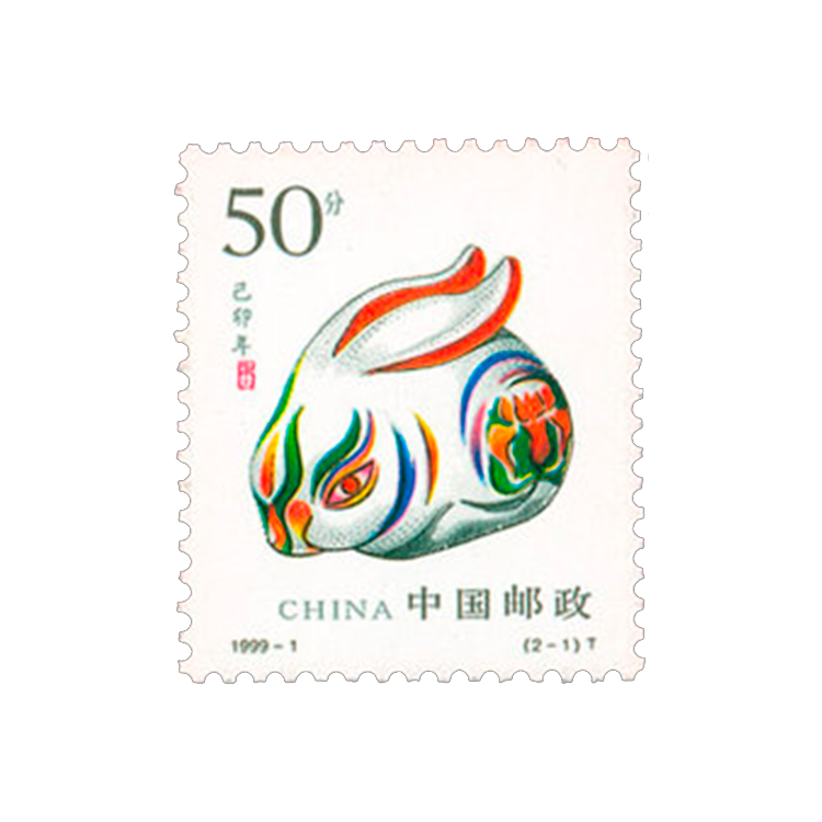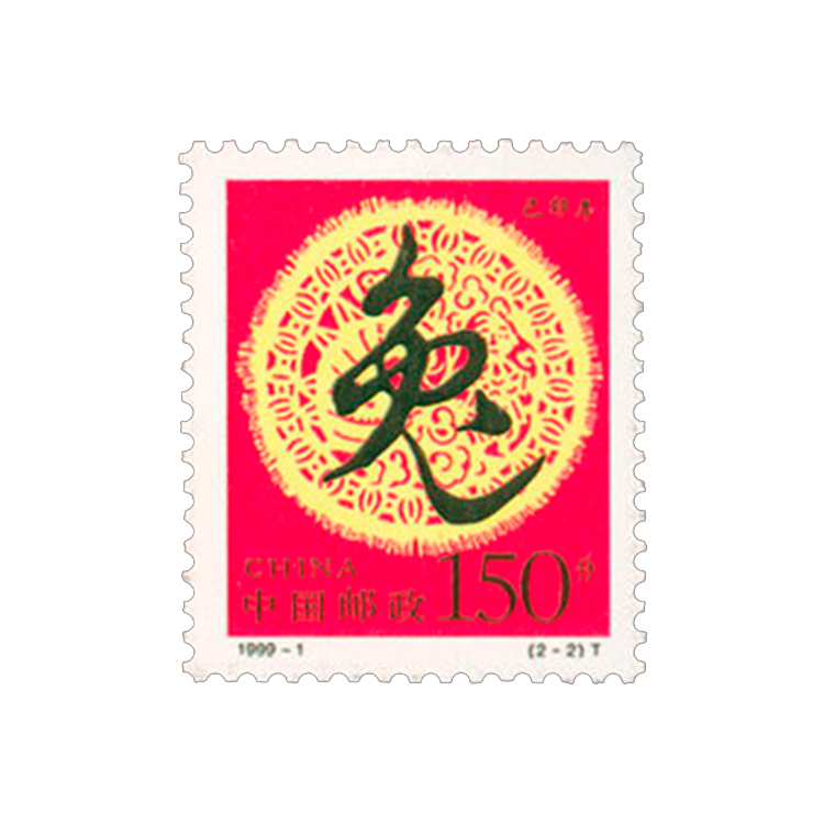 《己卯年》邮票全套2枚。第一枚邮票的图案采用了泥人张第四代传人,清华大学美术学院张锠教授捏的泥兔。这是一只以黑色为主的彩兔,它匍匐在地,双耳向后拢去,显得温顺而善良。但是,因为这枚生肖邮票图案适逢白底色,人们印象中的兔子多是白色的,民间传说又有“玉兔”之说,于是,设计者运用电脑技术对墨兔进行了“植皮手术”,由黑花兔至灰花兔再至白花兔,既给兔增添了一层“玉衡星散而为兔”的祥瑞色彩,又具有中国传统文化以兔为明月之精的吉祥、幸福的象征。画面左上角题有“己卯年”字样,铃有“己卯”红色印章,巧妙地点明了主题。 第二枚邮票图案以选自《五体字典》中的一个草书“兔”字为主图,字形灵秀,特别是倒数第2笔的那一钩,颇富动感,和第1枚图国150°案中的彩兔形态相匹配,能够让人品出“静若处女,动若脱兔”的意味。衬底采用清代山西“月亮图”剪纸,恰好解释了第1枚图案“玉兔为月“之名。整个图案采用红色铺底,既达到了红黄相衬的和谐效果,又透着一种迎春的喜庆气氛。