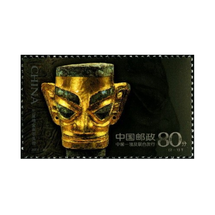 三星堆遗址位于四川广汉市南兴镇。因此处有起伏相连的三个黄土堆(三段古城墙遗址),其顶部高于四周农田10余米,像3颗金星一样分布着,故名“三星堆”。早在1929年,在这里便出现过数千年前的石器等文物。1986年又进行了重点挖掘,并发现了两座大型商代祭祀坑,出土了大量珍贵文物。邮票画面上这尊“金面罩铜质平顶人头像”,即是当年7月在一号坑内发掘出土。头像高42.5厘米,头像平顶,头发向后梳理,发辫上端扎束垂于脑后。戴面罩,立刀眉,杏眼,长直耳,耳垂穿孔,蒜头鼻,直鼻梁,阔口,闭唇。颈以下铸成倒三角形。面罩系用金箔制成,双眼双眉部位镂空,以土漆和石灰作粘合剂,将金面罩粘贴在铜头像上。这是三星堆雕像中最为珍贵的一件,现收藏于三星堆博物馆。
