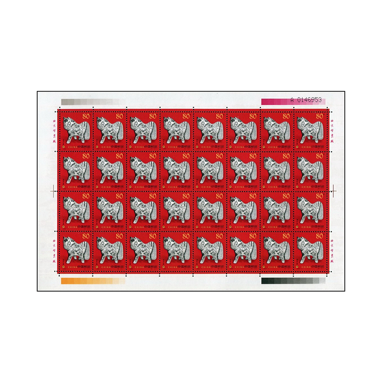 画面上这匹白底黑线条的泥塑马,系陕西省凤翔县纸坊乡六营村的民间艺人,年已72岁的胡深老汉所制作,马头微偏,通体浑圆饱满,既威武健壮,又活泼可爱。特别是双目用墨传神,马背上绘制的马鞍十分精致,带有3个串铃,马项上画有4块马鬃。其造型独县匠心,个性明显,艺术风格朴实淳厚,散发出浓郁的乡土气息。画面不留白边,喜庆的红色铺满整个票面,将这匹黑白线条的小马驹衬托得格外潇酒英俊。