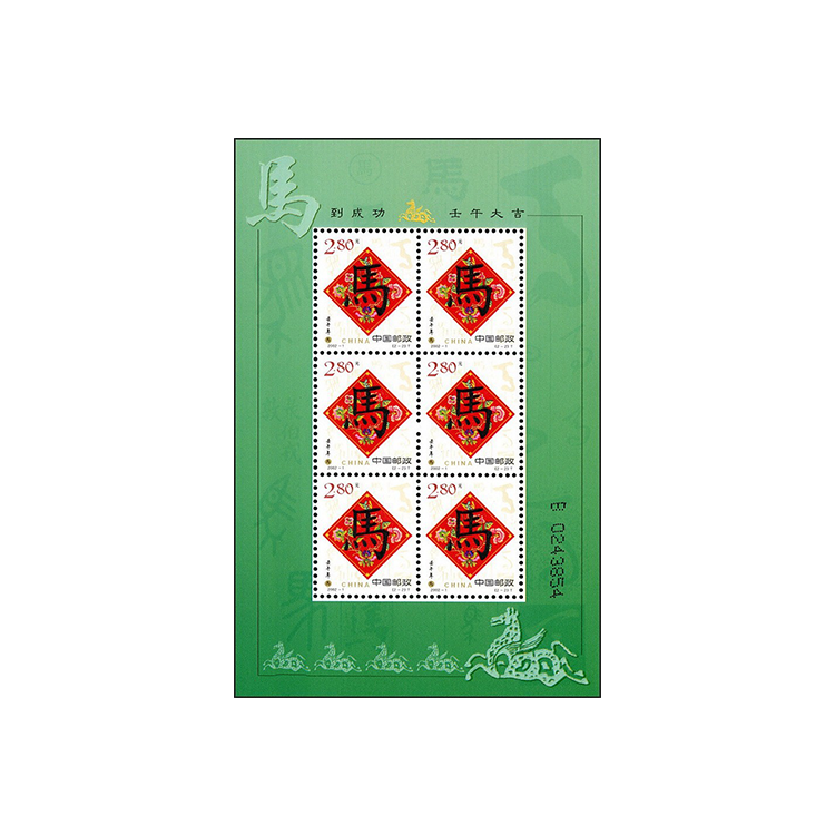 兑奖版以6枚邮票2×3居中排列,上方为“马到成功,壬午大吉”文字,其中“马”为繁体且大,文字之间是一装饰奔马。下方为四小一大的装饰奔马。底图中为各种字体的“马”字。