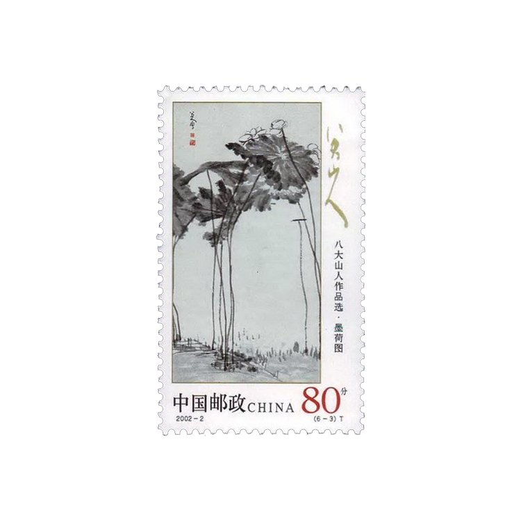 八大山人的传世画作不多。这套邮票所选6幅作品,皆为其代表作,体现了画家的绘画风格和艺术成果。只是邮票设计者把其类似“哭之”,“笑之”的八大山人签名,放在作品之外,置于邮票右上方醒目的位置,这是八大山人画的标记。版票的边饰为八大山人的画像。