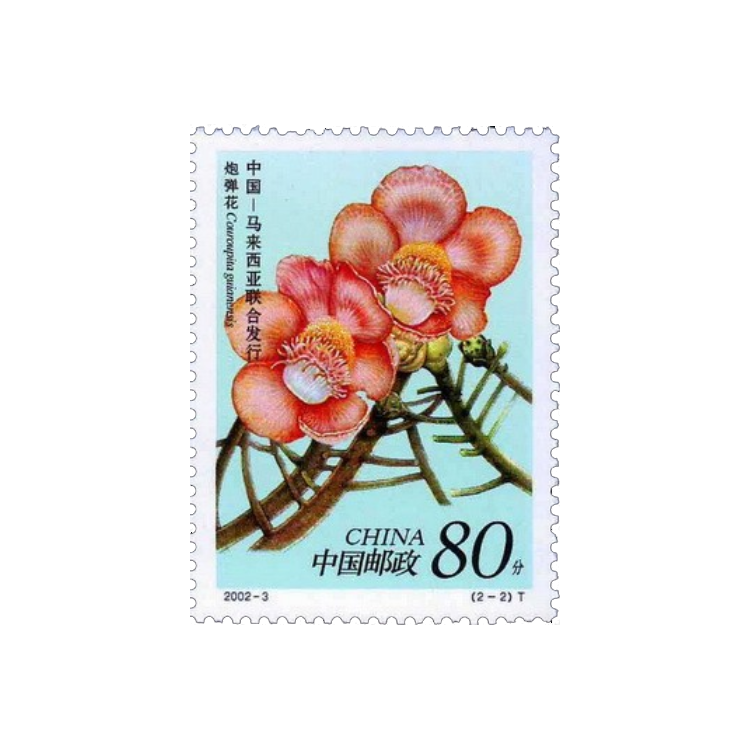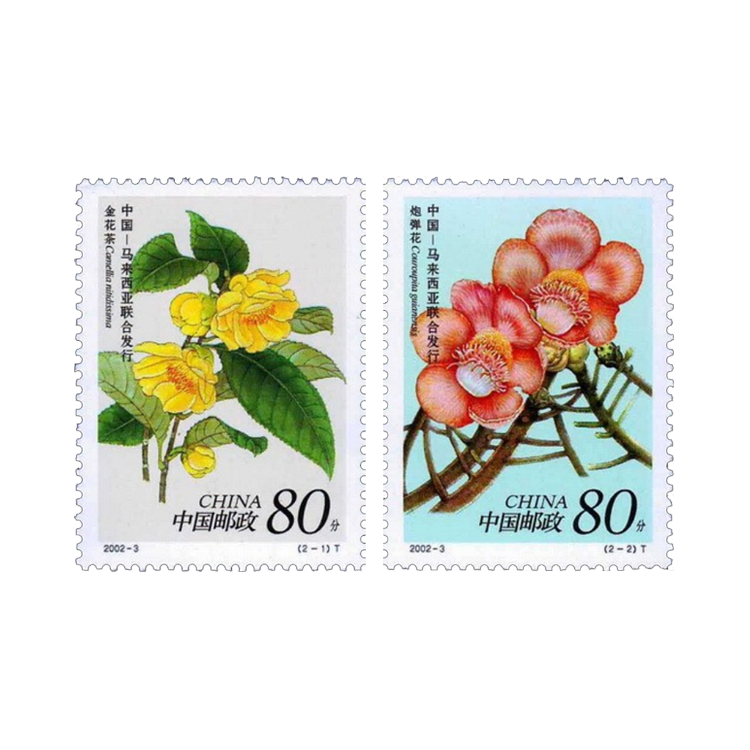 本套邮票采用连票形式,选择珍稀花卉为票图,金花茶为淡黄色底,炮弹花为淡绿色底,象征着中马两国友好关系,正如鲜花一样盛开。