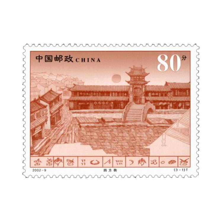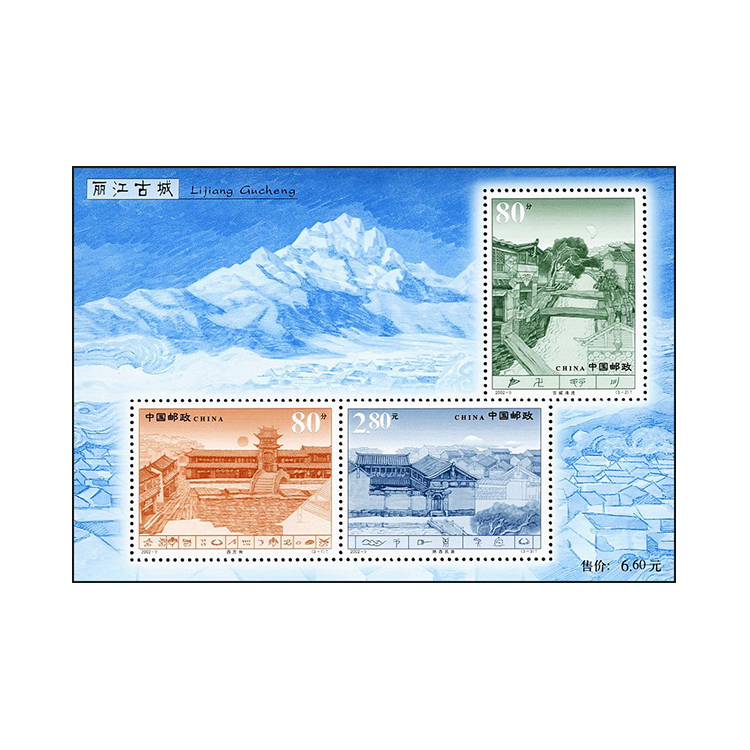 小全张“丽江古城”以巍巍玉龙雪山为背景,全面展示了丽江古城的风貌。3枚邮票第1和第3图排列在左下方,第2图在右上角,左上角为“丽江古城”文字和拼音。画面古色古香,文图对照,有较高的文化内涵。