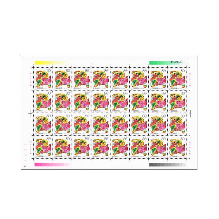 小版张8枚邮票居中3×3排列,中间一枚位置为过桥票,系民间艺人刘静兰的剪纸作品。上下边饰中有各种字体的“羊”字,邮票下面居中有一古瓦当“羊角”图案,“北京邮票厂”印在右下角。