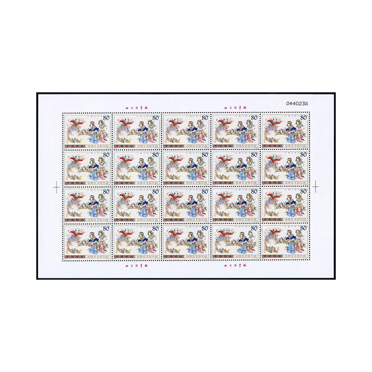 小版张画面:1套4枚连印邮票排列右上角,另1套4枚连印邮票排列偏左居中;右侧居中为杨柳青木版年画文字介绍和“畵”字红色印章;左上角为“怀抱莲子的童子”的年画图样,下面为“杨柳青木版年画”文字和拼音;画面下方为“怀抱鲤鱼和荷花的童子”画。左下角为“北京邮票厂”。底色为黄色。